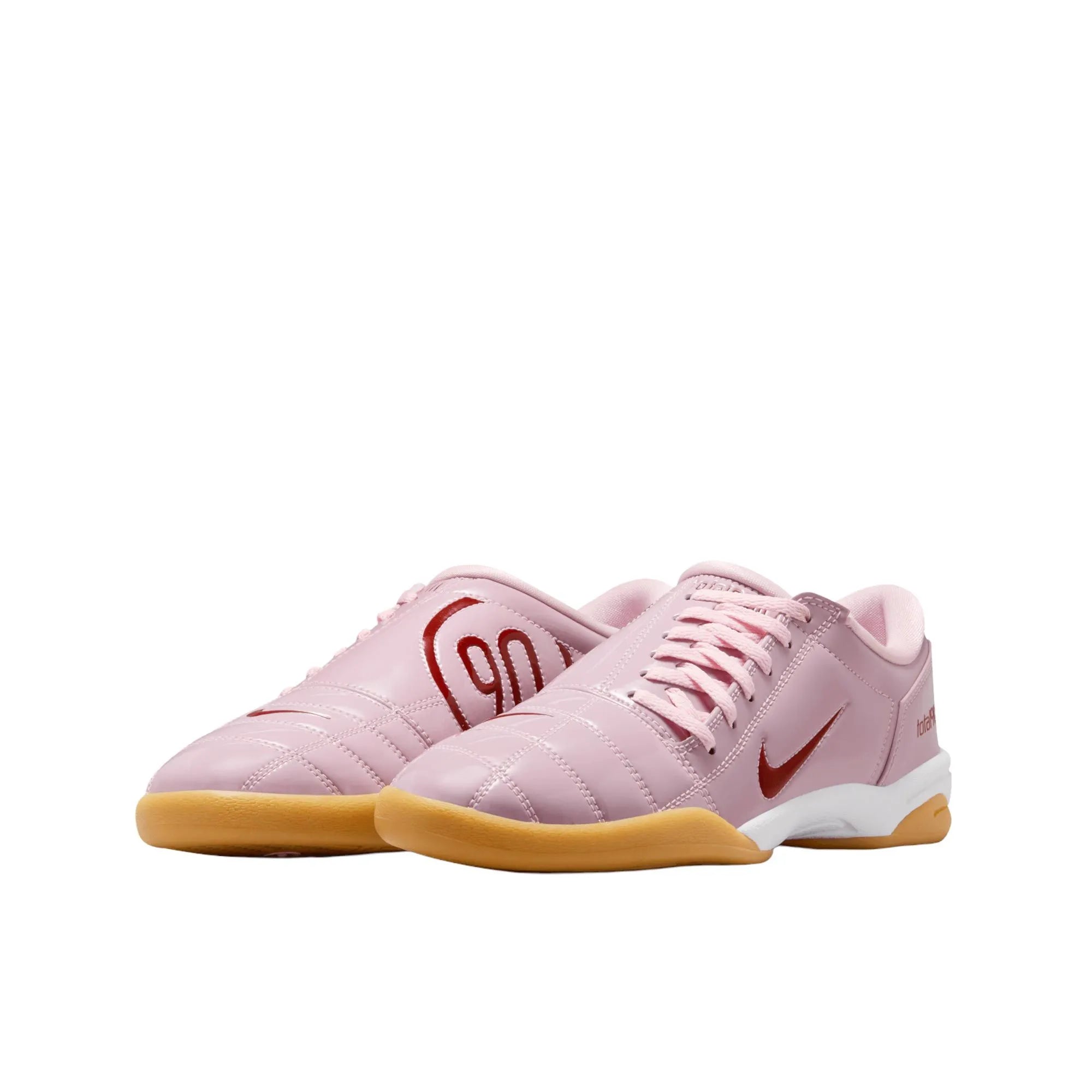 The Nike Total 90 Women's "Pink Foam" is a Y2K-inspired, modern take on the iconic 2000s football boot designed for everyday wear, featuring a glossy pink patent leather quilted upper, asymmetrical lacing, and a white midsole with a gum rubber outsole for street-style traction and comfort.